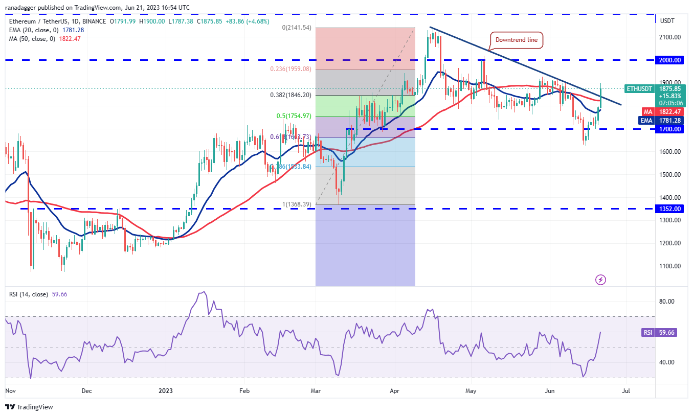 The bulls continued their purchase and pushed the price above the 20-day EMA ($1,781) on June 20. This was the first sign that the bears were losing their grip. The bullish momentum picked up further on June 21 and sent the ETH/USDT pair above the downtrend line. The pair is expected to rally to the psychological resistance at $2,000.