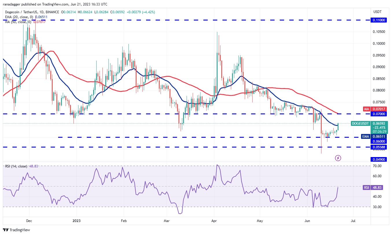 Dogecoin (DOGE) bounced off the strong support at $0.06 on June 20, indicating that the bulls are fiercely defending this level.