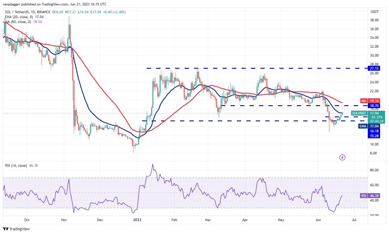 Solana (SOL) rose above the immediate resistance of $16.18 on June 20 and reached the 20-day EMA ($17.04) on June 21.
