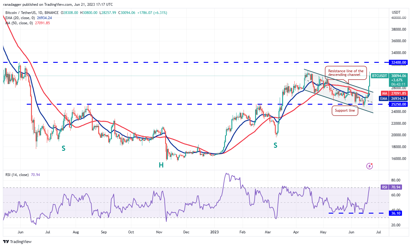 Bitcoin broke and closed above the 20-day exponential moving average ($26,934) on June 17. The bears tried to sink the price back below the level on June 18 but the bulls held their ground.