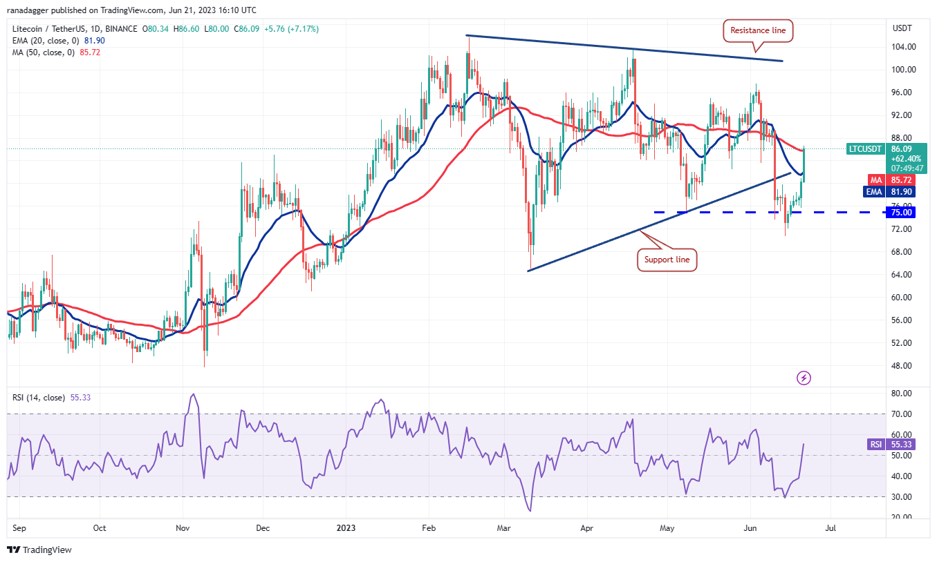The buying continued on June 21 and the bulls propelled the price above the 20-day EMA ($81), signaling a comeback. There is a minor resistance at the 50-day SMA ($85) but it is likely to be crossed. The LTC/USDT pair may first hit $92 and then $98.