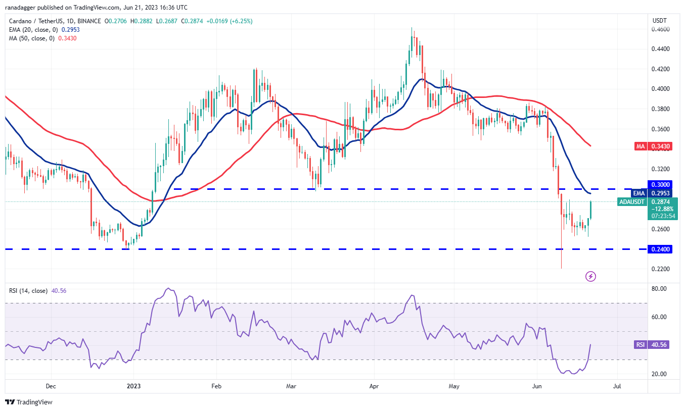 The long tail on Cardano’s (ADA) June 20 candlestick shows that the bulls are trying to guard the zone between $0.25 and $0.24.