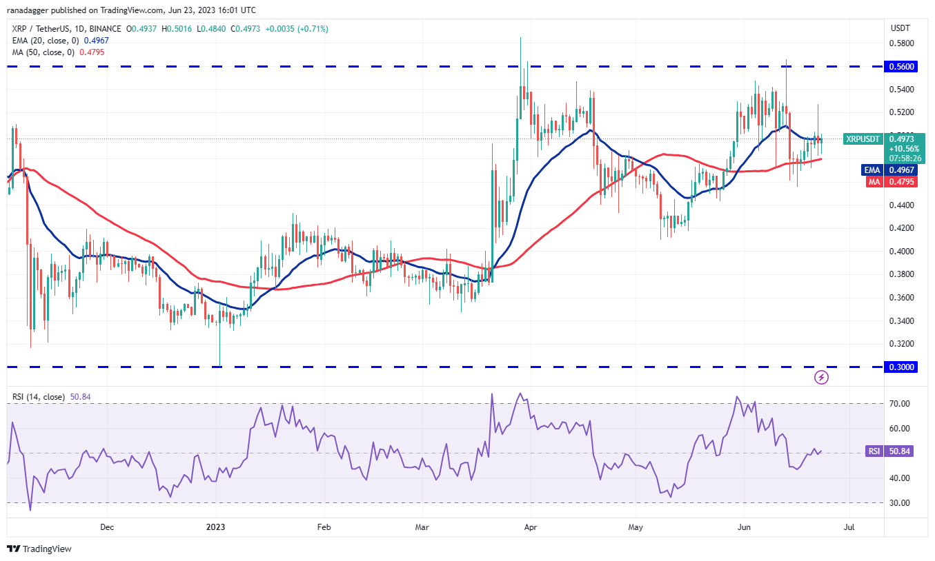 XRP’s (XRP) recovery picked up momentum on June 22 and the bulls kicked the price above the 20-day EMA ($0.49). However, the long wick on the day’s candlestick shows that the bears are unlikely to give up easily.