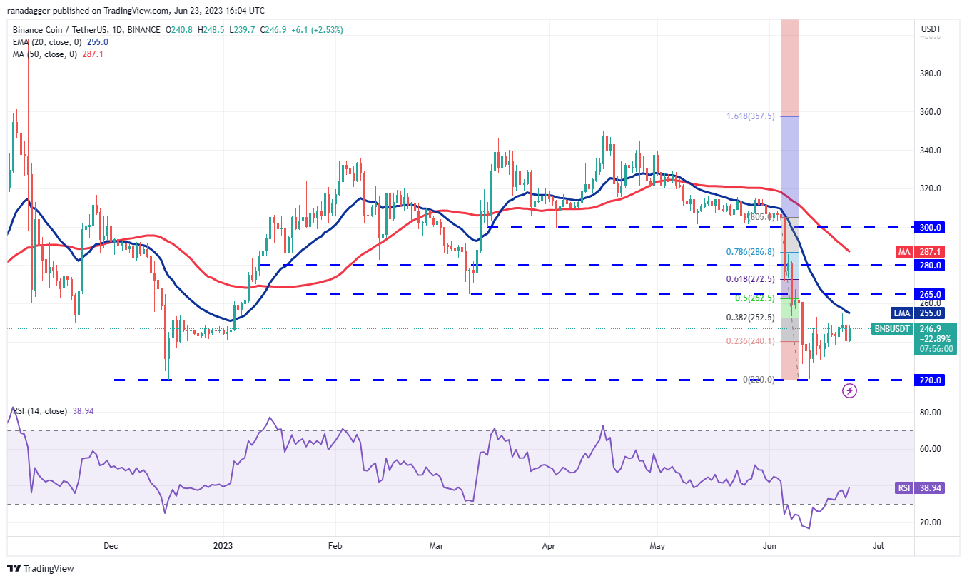 BNB (BNB) turned down from the 20-day EMA ($255) on June 22, indicating that the sentiment remains negative and traders are selling on rallies.