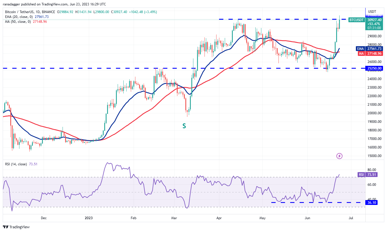 The uncertainty of the June 22 Doji candlestick pattern resolved to the upside on June 23. Buyers will again try to sustain the price above $31,000. If they succeed, the BTC/USDT pair could first rise to $32,400 and thereafter make a dash toward the next major resistance at $40,000.