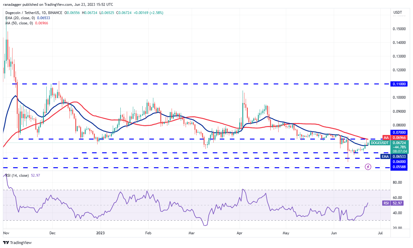 Dogecoin (DOGE) turned down sharply from the overhead resistance of $0.07 on June 22, indicating that the bears are guarding the level with vigor.