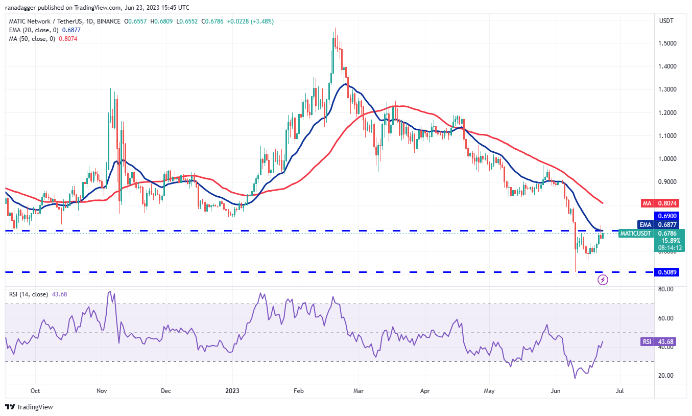 The bulls pushed Polygon (MATIC) above the breakdown level of $0.69 on June 22 but the long wick on the candlestick shows that the bears are trying to protect the level.