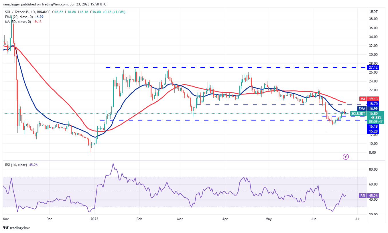 The bulls pushed Solana (SOL) above the 20-day EMA ($17) on June 21 but they could not sustain the higher levels. Sellers pulled the price back below the level on June 22.