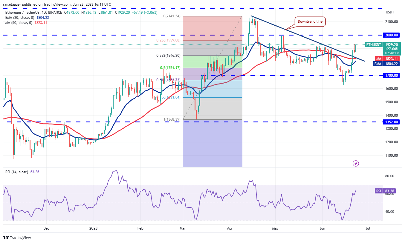 Ether (ETH) is attempting to resume its up-move. The bulls pushed the price above the overhead resistance of $1,928 on June 22 but could not sustain the higher levels.