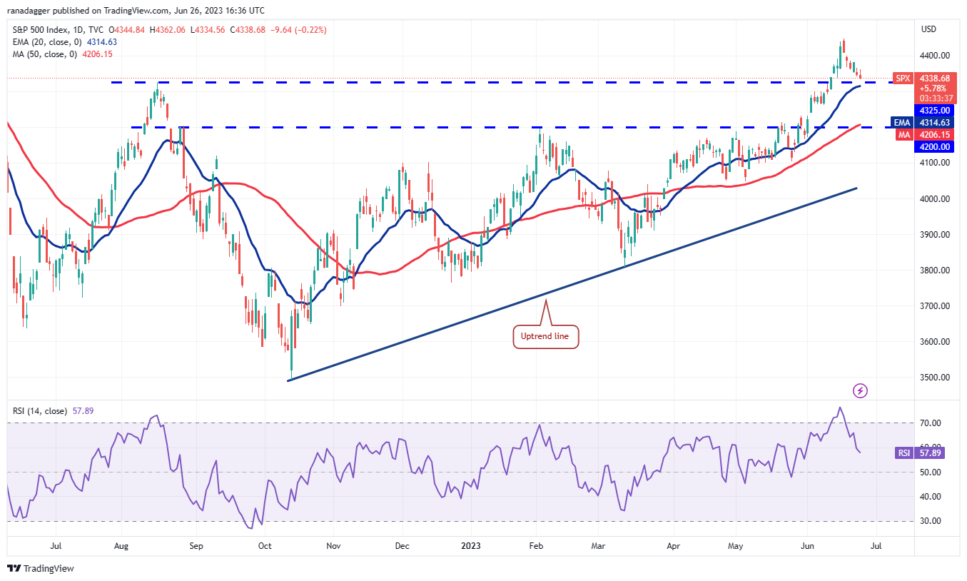 The S&P 500 Index turned down from 4,448 on June 16, indicating that the short-term bulls are booking profits. That has pulled the price to the breakout level near 4,325. The 20-day exponential moving average (4,314) is placed just below this level, hence the bulls are likely to defend it aggressively.
