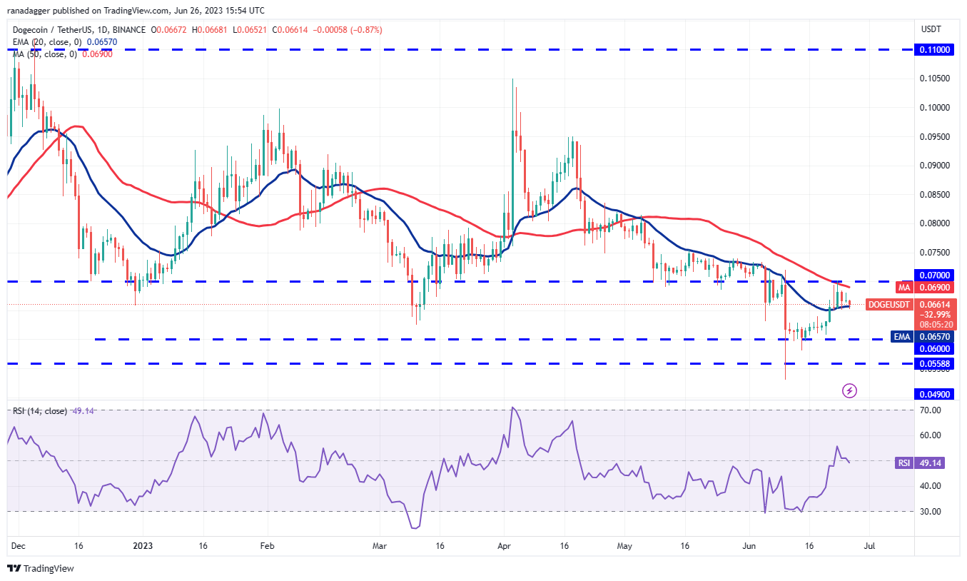 Dogecoin (DOGE) turned down from the overhead resistance of $0.07 on June 23, indicating that the bears are defending the level with vigor.