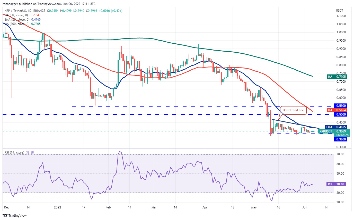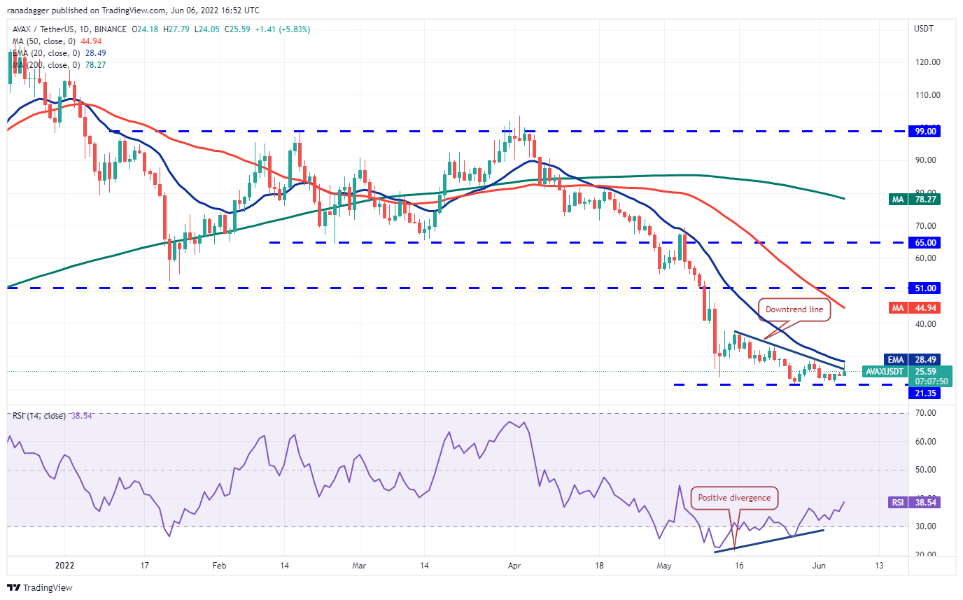 Avalanche (AVAX) bounced off $22.14 on June 4, indicating that bulls are defending the $21.35 support with vigor. The buyers have pushed the price above the downtrend line and are attempting to clear the overhead hurdle at the 20-day EMA ($28).