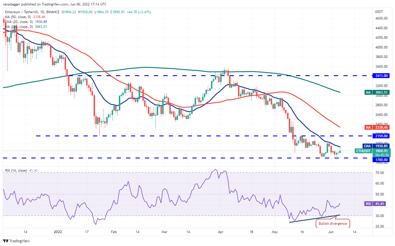 Ether (ETH) bounced off $1,737 on June 3, indicating that bulls are attempting to defend the crucial support of $1,700. The buyers are attempting to push the price above the overhead resistance at the 20-day EMA ($1,930) on June 6.