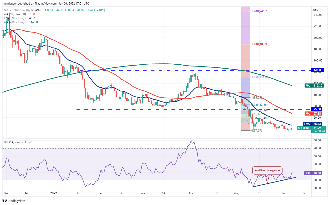 Solana (SOL) plunged below the critical support of $37 on June 4 but a minor positive is that the bulls purchased at lower levels. This may have caught the aggressive bears off-guard, which resulted in a strong recovery as seen from the long tail on the day’s candlestick.