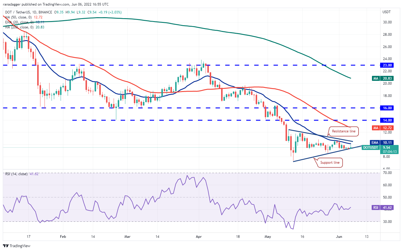 A break and close above the triangle will be the first indication of a potential trend change. The DOT/USDT pair could rise to $12 and then attempt a rally to the breakdown level of $14. The bears are likely to defend this level aggressively.
