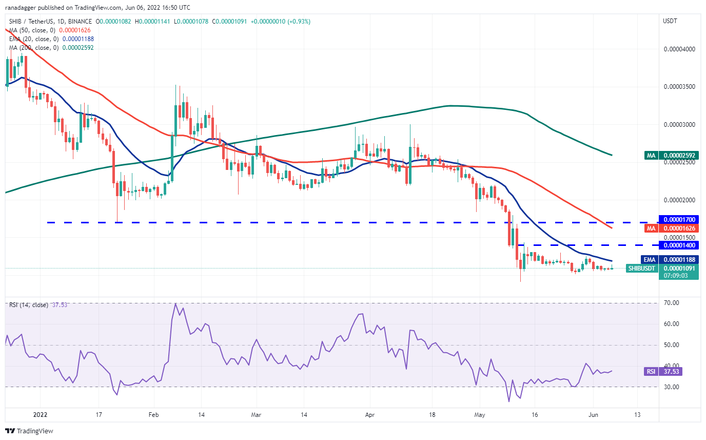 The buyers have successfully defended the $0.000010 support for the past several days but they have not been able to push Shiba Inu (SHIB) above the 20-day EMA ($0.000012). This suggests that buying dries up at higher levels.