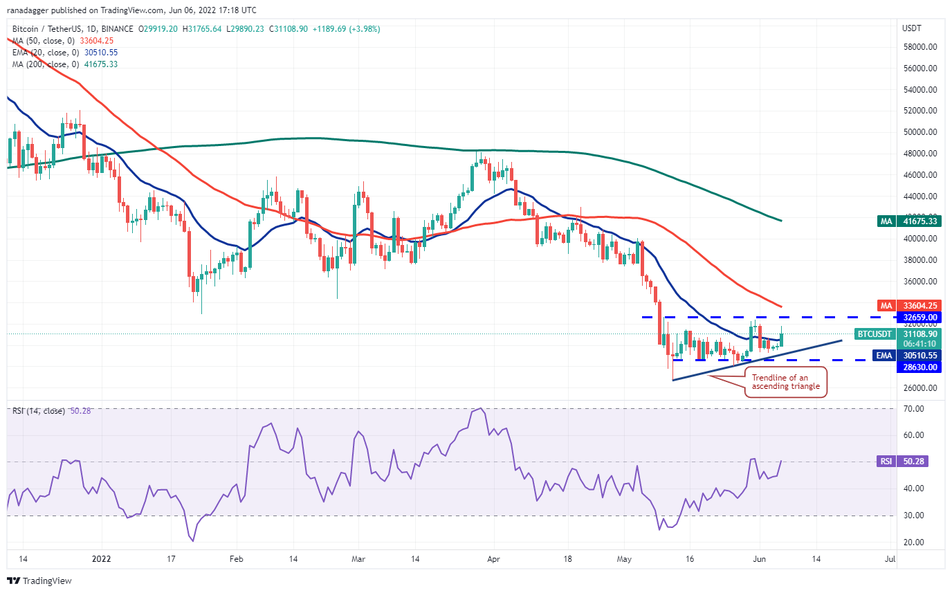 After two small range days on June 4 and 5, the range expanded on June 6 and Bitcoin soared above the 20-day exponential moving average (E($30,510). The bulls are attempting to push the price to the overhead resistance at $32,659.