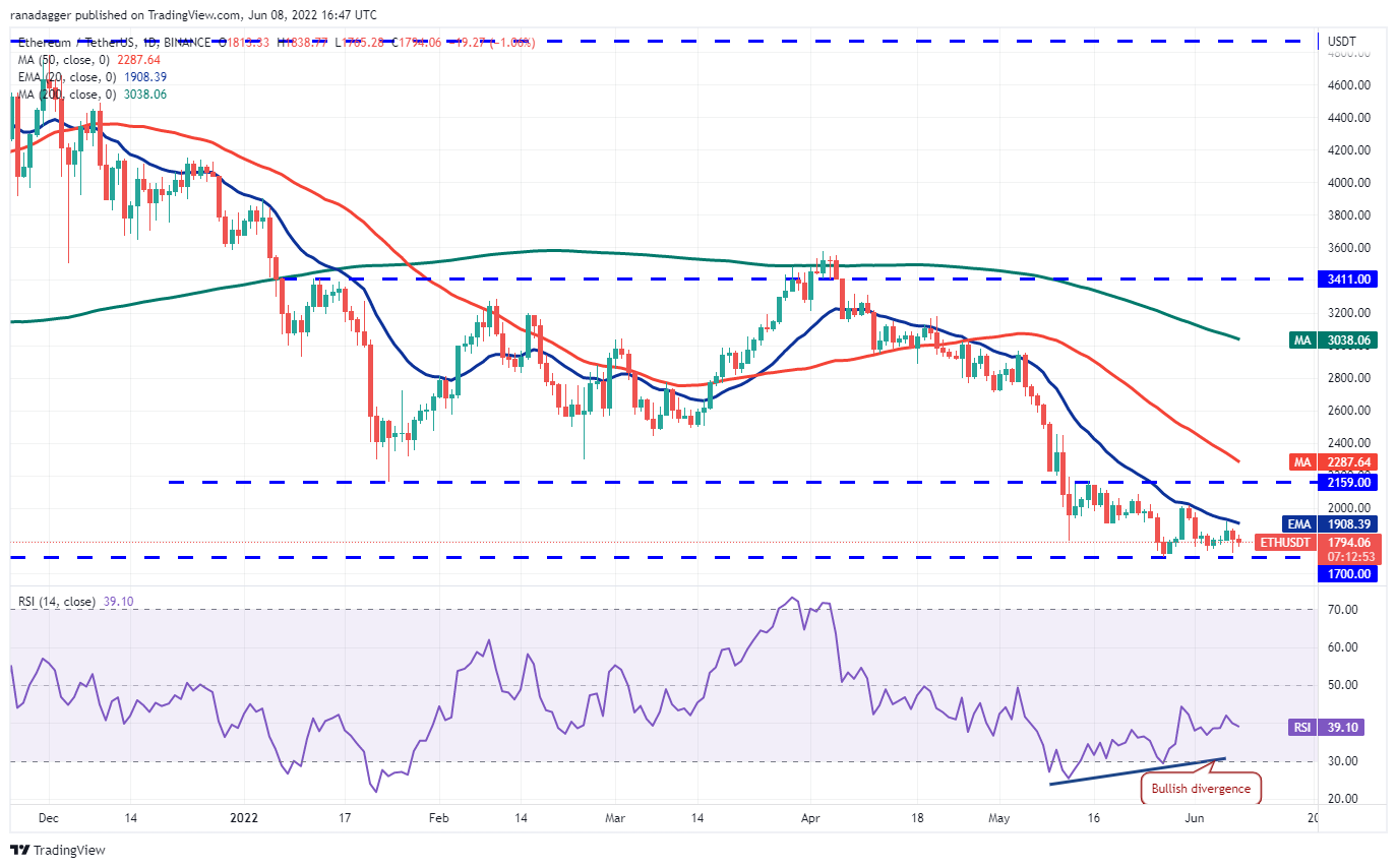 Ether (ETH) turned down from the 20-day EMA ($1,908) on June 6, indicating that bears are not willing to cede ground to the bulls. The sellers then tried to sink the price below the critical support of $1,700 on June 7 but the long tail on the candlestick shows aggressive buying by the bulls near the support.