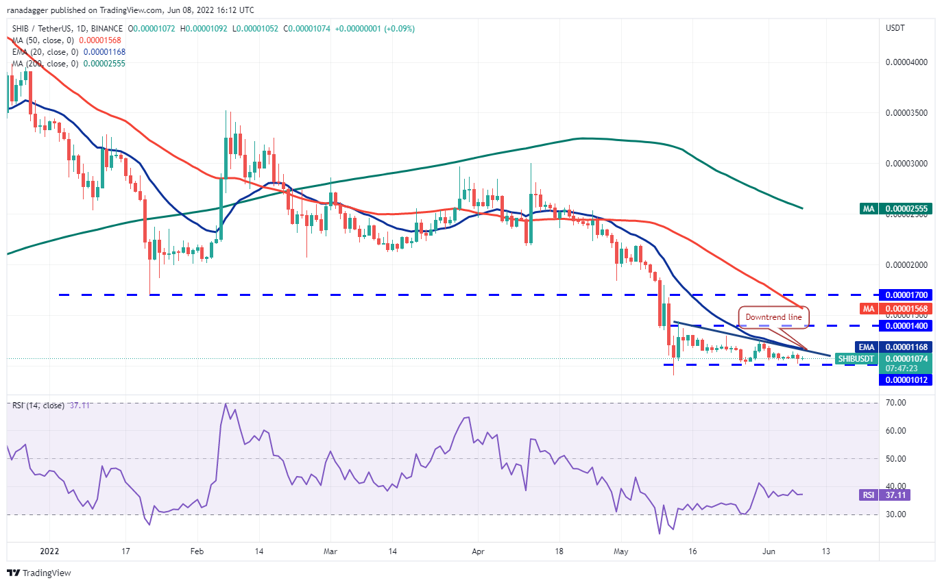 The bears tried to sink Shiba Inu (SHIB) below the strong support of $0.000010 on June 7 but the bulls successfully defended the level as seen from the long tail on the day’s candlestick.