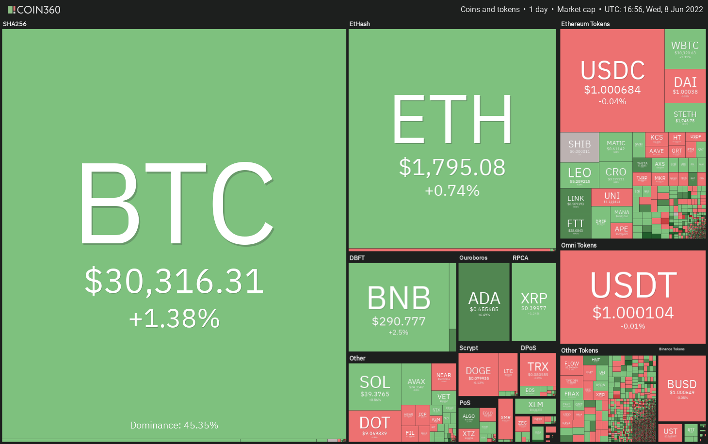 However, a minor negative is that the bulls could not build upon the momentum on June 8. This gave an opportunity to the bears who have again pulled the price back below the 20-day EMA. This suggests that bears continue to sell in the zone between the 20-day EMA and $32,659.