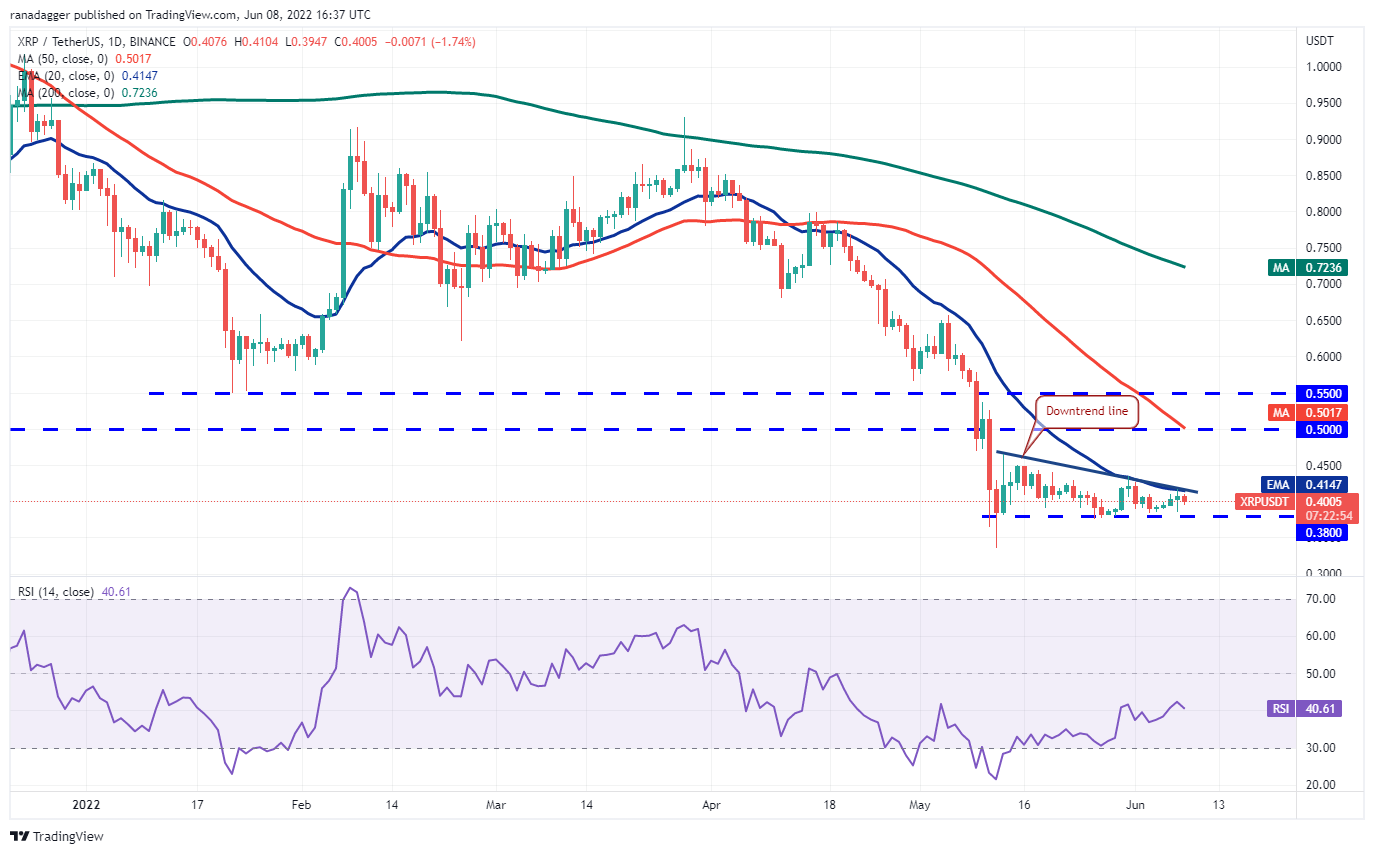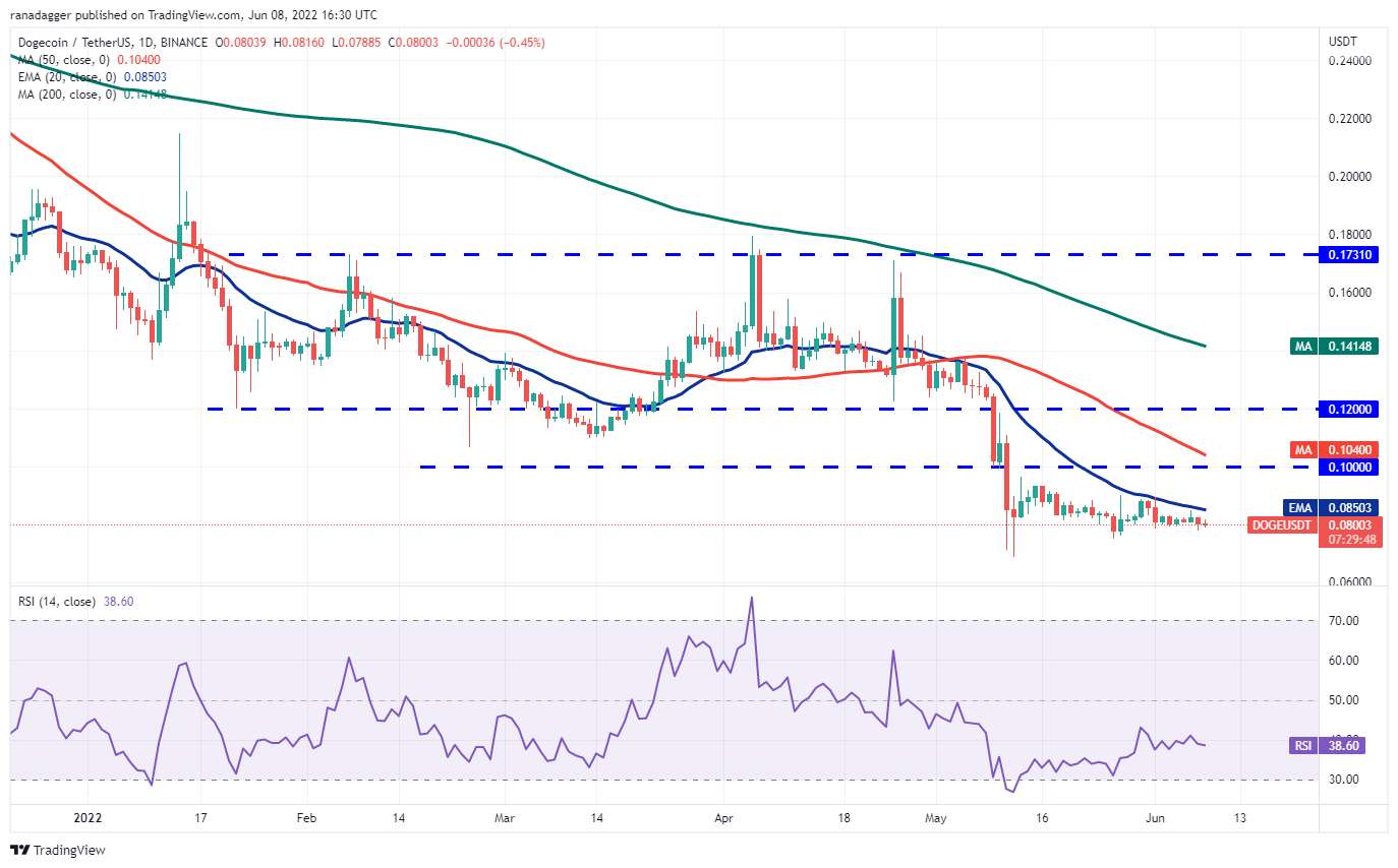 Dogecoin (DOGE) once again turned down from the 20-day EMA ($0.08) on June 6, indicating that bears are selling on rallies. A minor positive is that the bulls purchased the dip on June 7, indicating buying at lower levels.