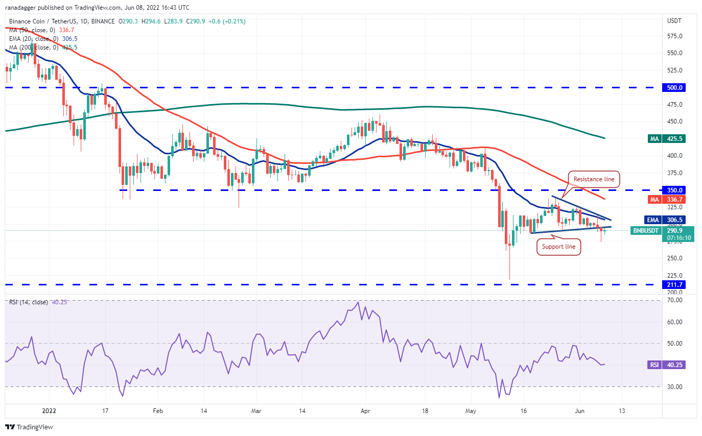 BNB turned down from the resistance line of the symmetrical triangle pattern on June 6 and plunged below the support line. This suggests that the bears continue to sell aggressively at higher levels.