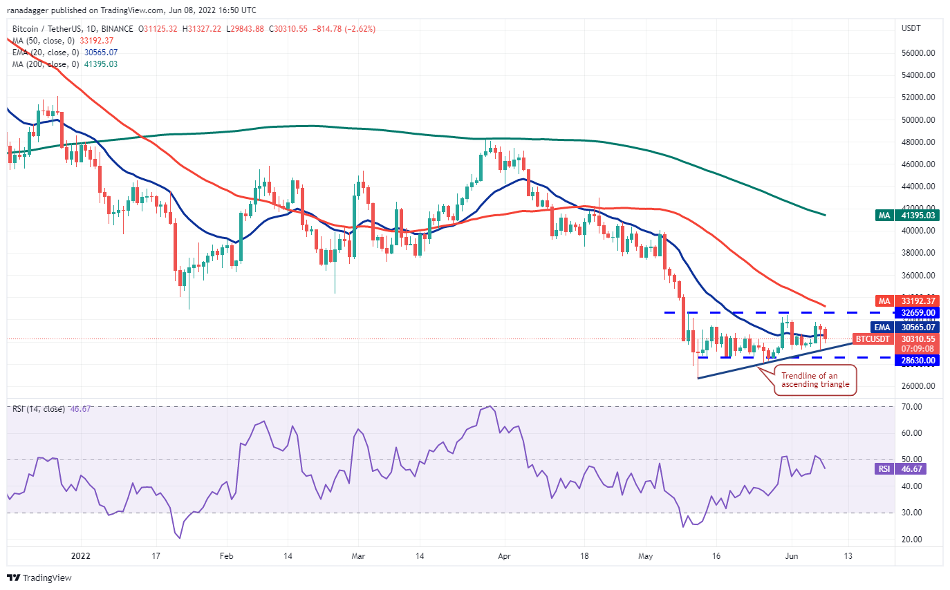 Bitcoin plunged below the 20-day exponential moving average (EMA) ($30,565) on June 7 but a positive sign is that the bulls aggressively purchased the dip to the trendline of the ascending triangle pattern. This resulted in a strong recovery as seen from the long tail on the day’s candlestick. The ascending triangle pattern remains intact favoring the buyers.