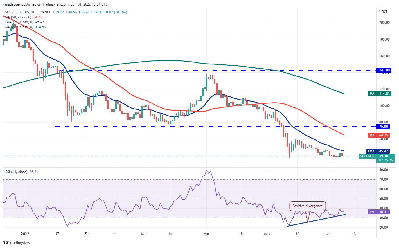 Solana’s (SOL) attempt to start a recovery met with stiff resistance at the 20-day EMA ($45), which suggests that the trend remains negative and traders are selling on rallies.