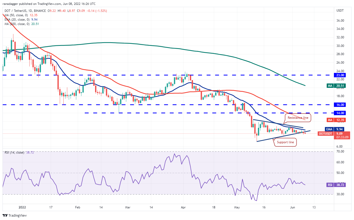 The DOT/USDT pair dipped below the support line on June 7, indicating that the symmetrical triangle resolved in favor of the sellers. The pair could next drop to the strong support at $8.50 where the buyers will try to stall the decline.