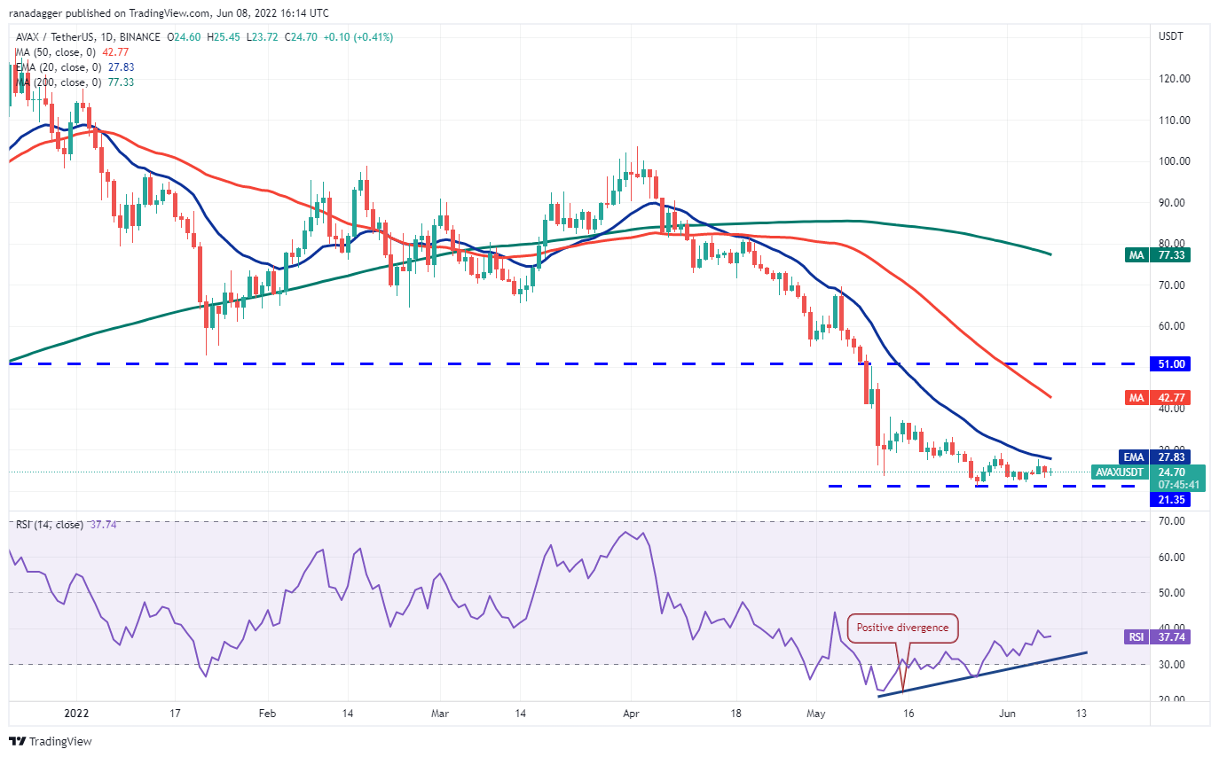 The buyers tried to push Avalanche (AVAX) above the 20-day EMA ($28) on June 6 but the long wick on the day’s candlestick shows that the bears are defending the level aggressively.