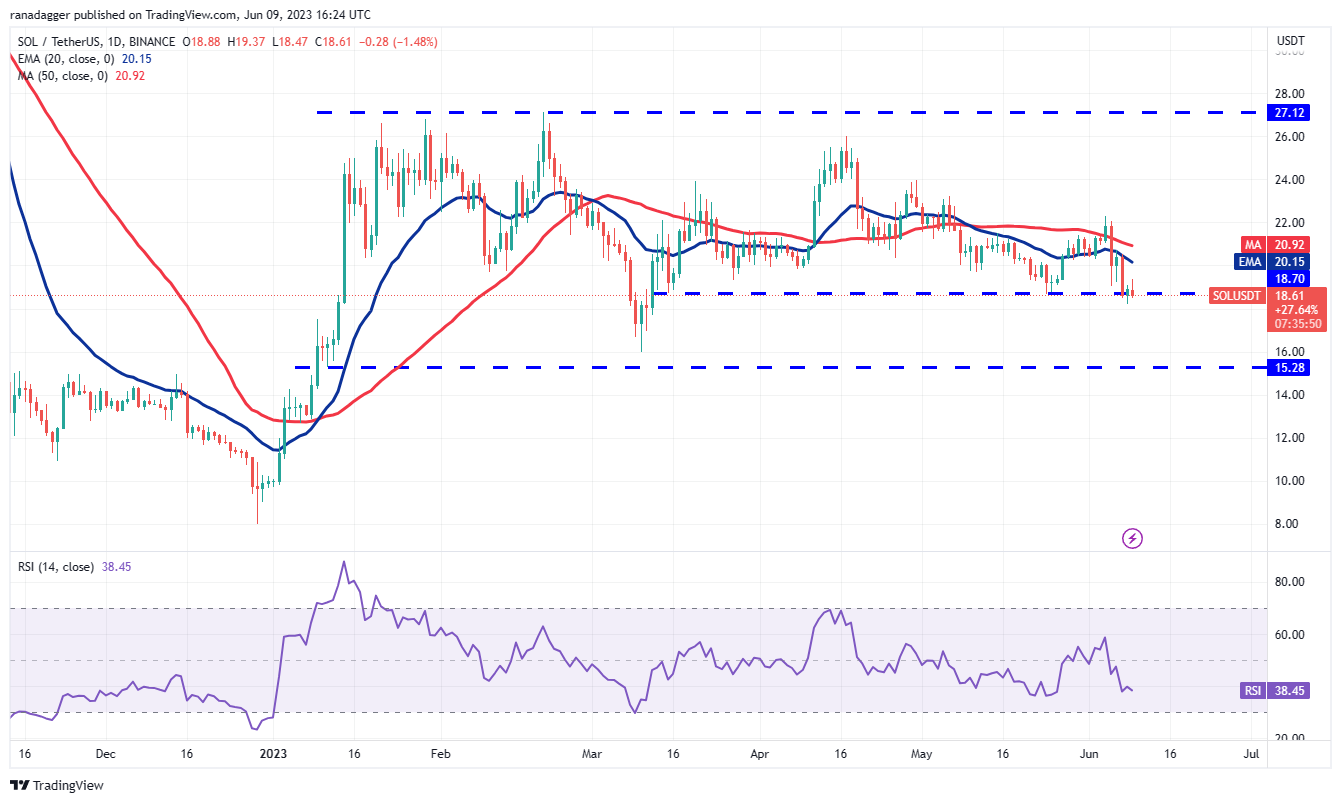 Solana (SOL) dipped below the $18.70 support on June 8 but the long tail on the candlestick shows that the bulls are trying to protect the level.