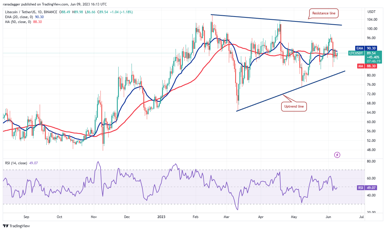 The bulls repeatedly purchased the dip below the 50-day SMA ($88) between June 7 and 9, indicating solid demand at lower levels. However, the bears have not given up as they continue to sell Litecoin (LTC) near the 20-day EMA ($90).