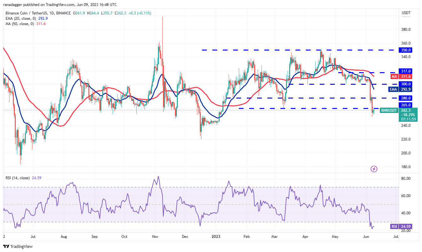 BNB (BNB) nosedived below the important support of $265 on June 7. The bulls tried to push the price back above the breakdown level on June 8 but the bulls held their ground.