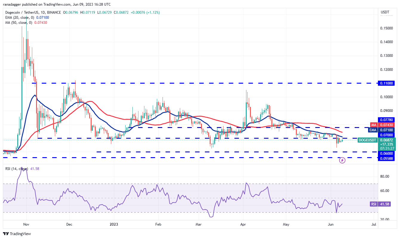Dogecoin (DOGE) remains below the breakdown level of $0.07 but the bulls have not allowed the bears to sink the price to the next support near $0.06.