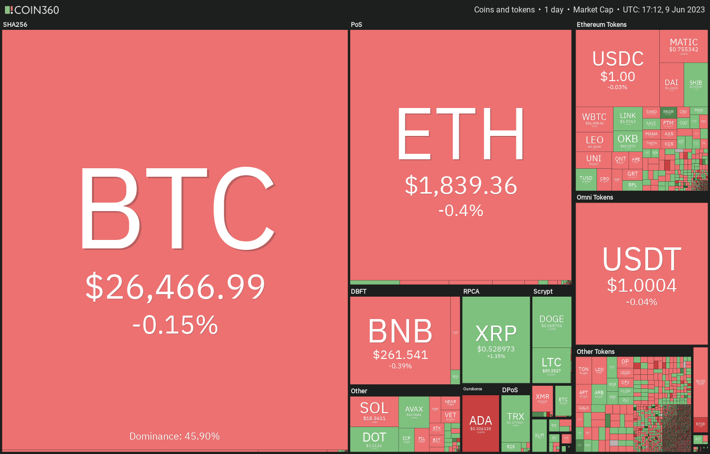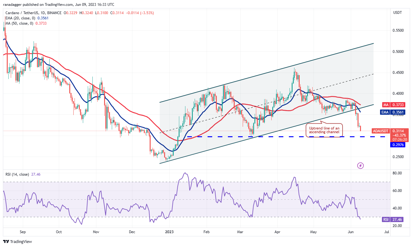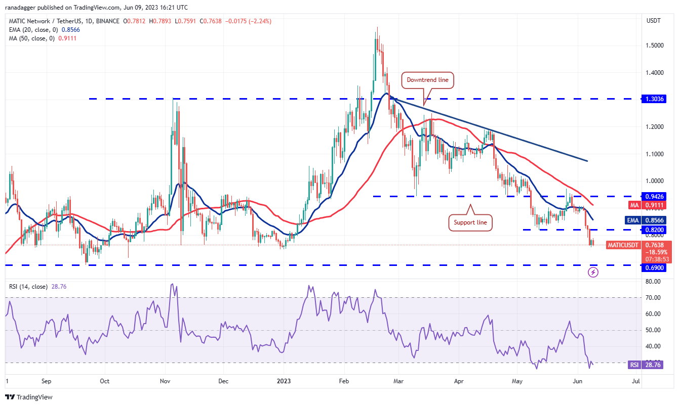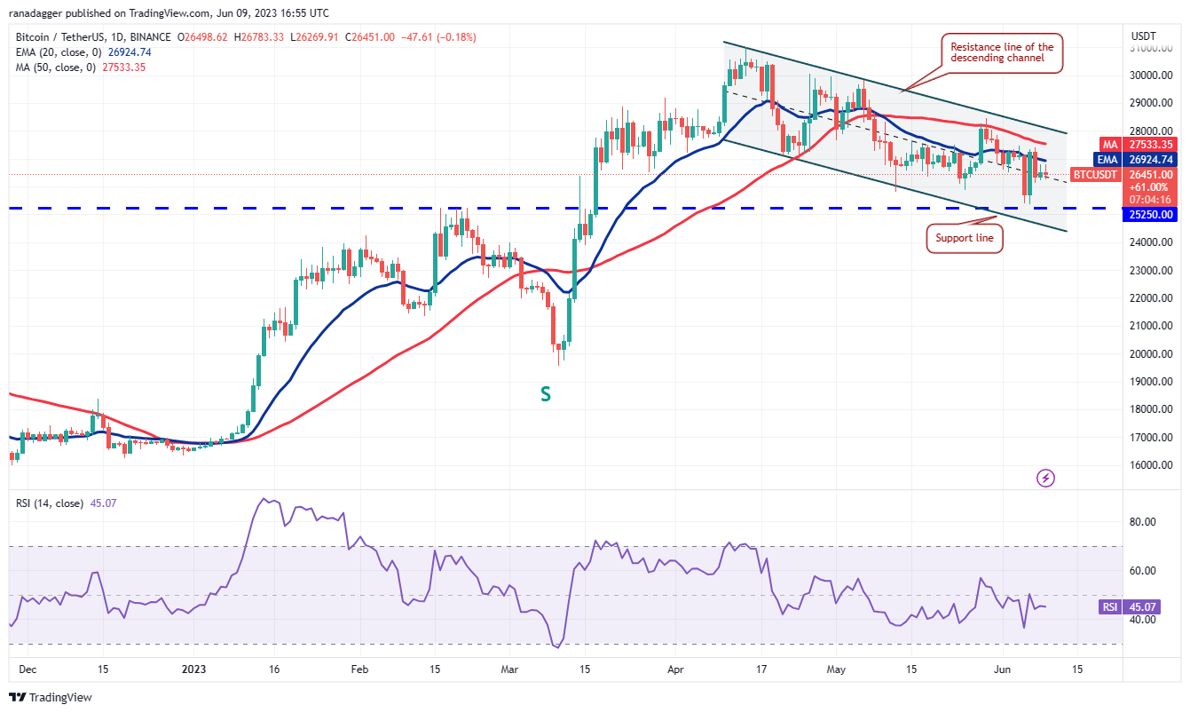 Bitcoin turned down from the moving averages on June 7 but a minor positive is that the bulls did not allow the price to slump below $26,125. This suggests that lower levels are attracting buyers.