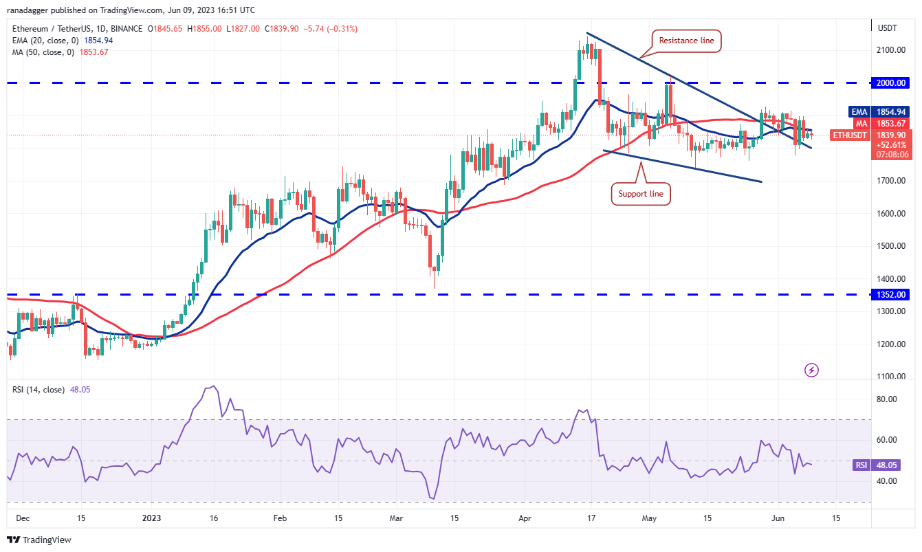 The 20-day EMA ($1,854) has flattened out and the relative strength index (RSI) is near the midpoint, indicating a balance between supply and demand. This balance will tilt in favor of the bears if they yank the price below $1,778. The ETH/USDT pair may then slip to $1,740 and subsequently to the support line of the wedge.