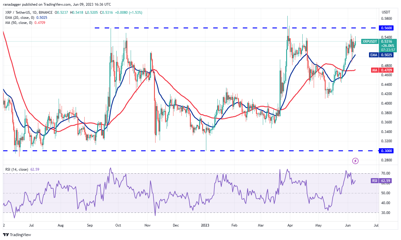 XRP (XRP) remains in an up-move. The bears tried to start a correction but could not pull the price to the 20-day EMA ($0.50) on June 7 indicating that the bulls are holding strong.