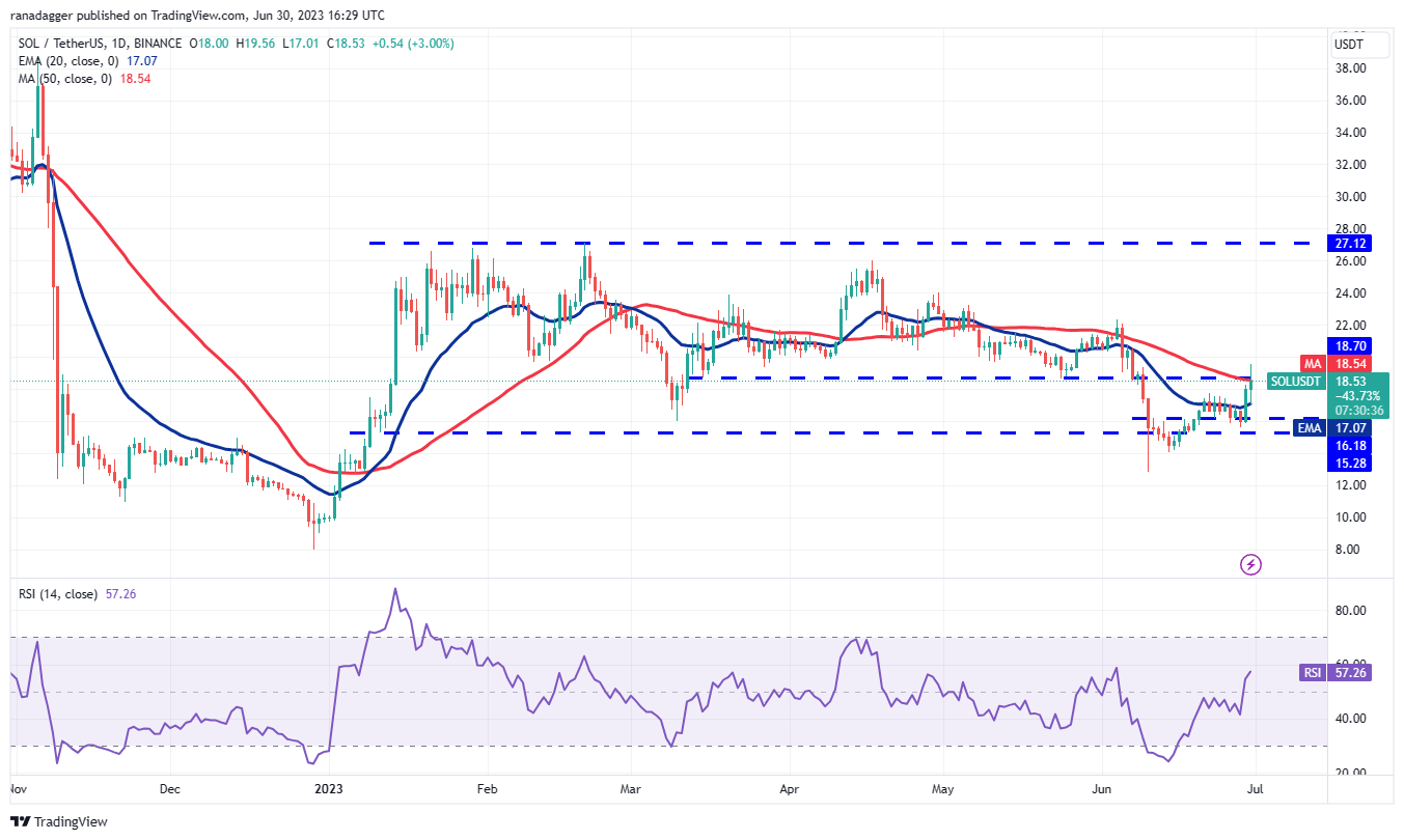 The buying continued on June 30 and the bulls are trying to drive the price above the breakdown level of $18.70. If they can pull it off, the SOL/USDT pair may shoot up to $22 and subsequently to $24.