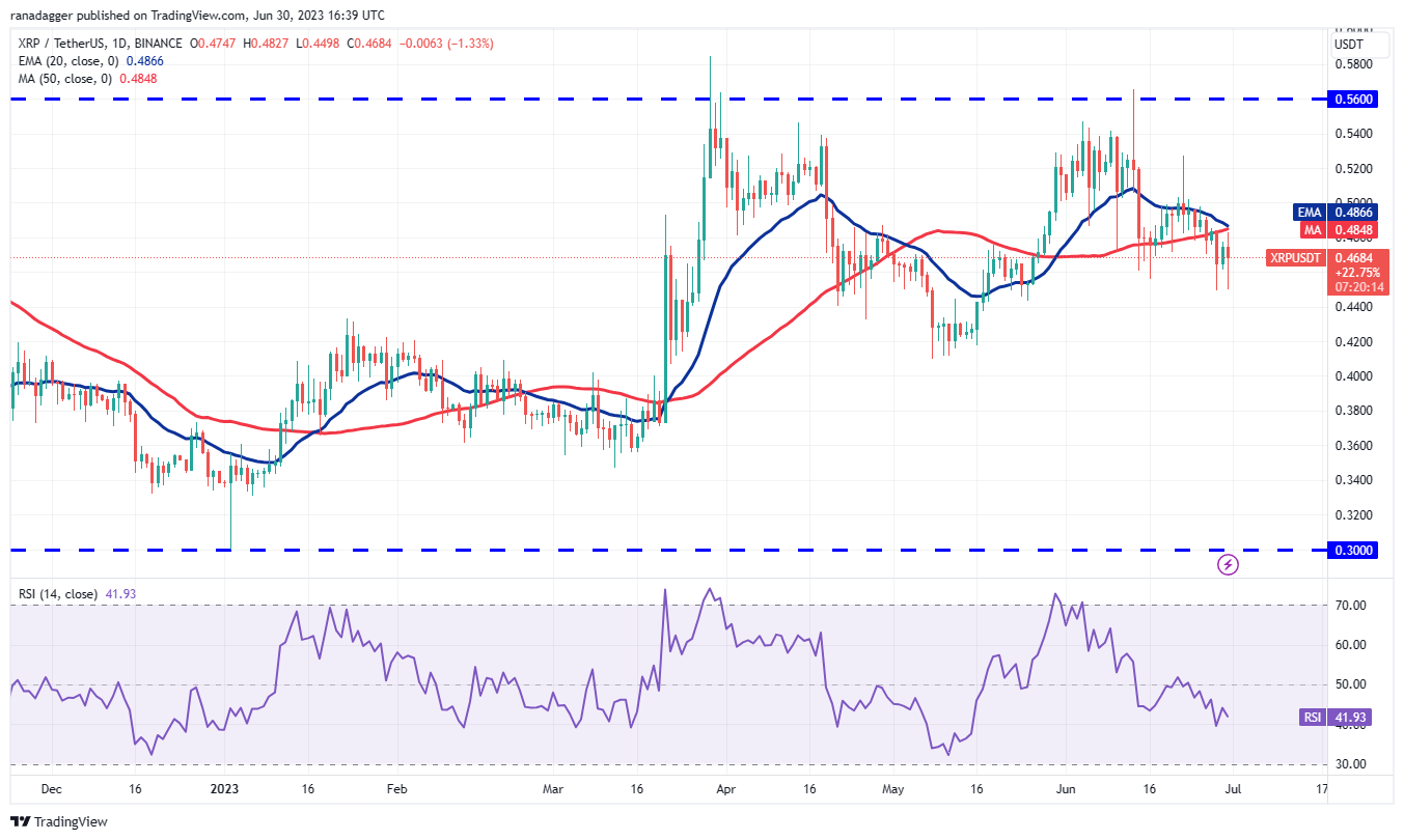 XRP (XRP) fell close to the first support at $0.44 on June 28 and June 30 but the long tail on the candlesticks shows strong buying at lower levels.