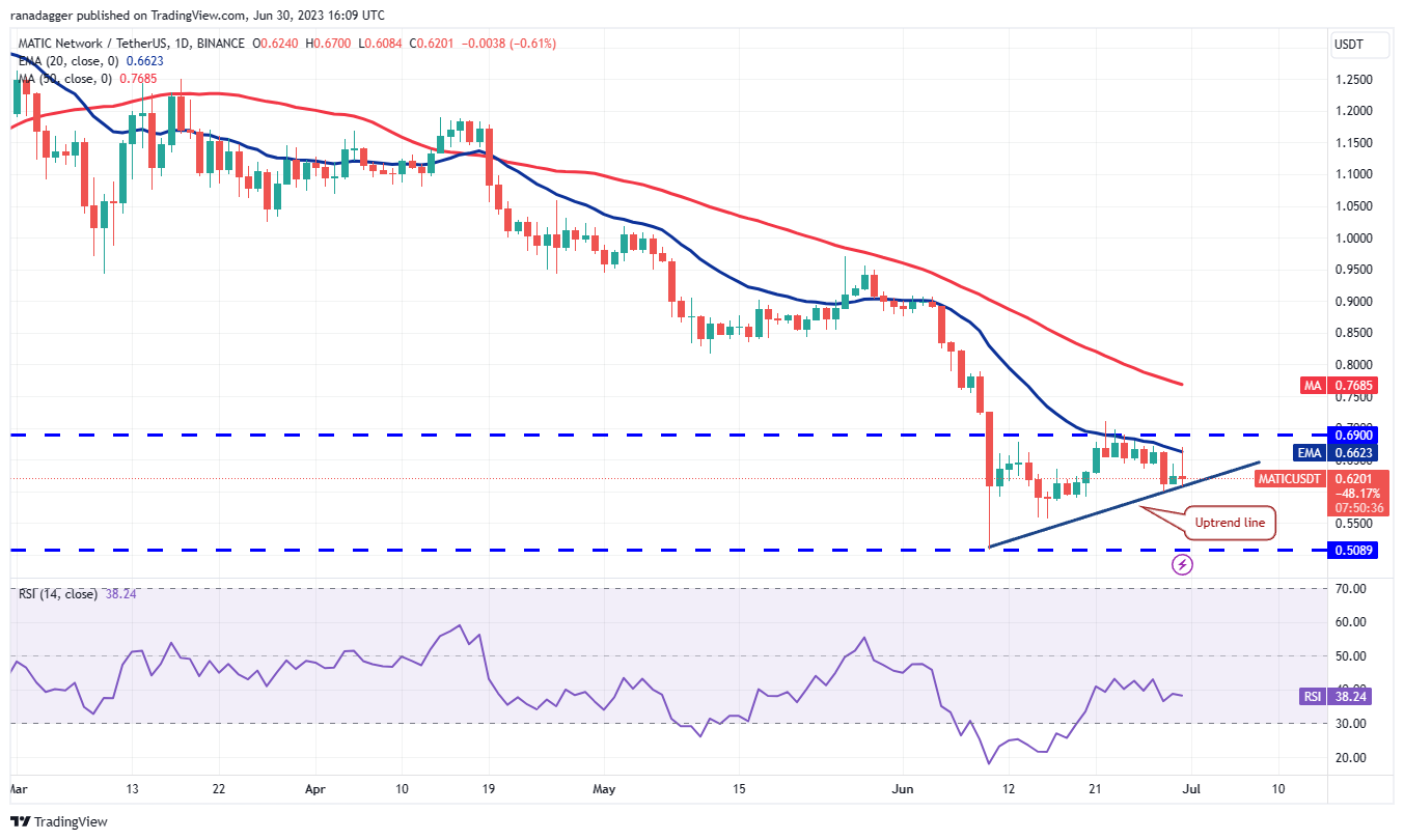 The bulls tried to push the price above the 20-day EMA ($0.66) on June 30 but the long wick on the candlestick shows aggressive selling at higher levels. If the price dips below the uptrend line, the MATIC/USDT pair may slide toward $0.55.