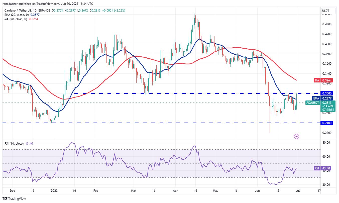 Cardano (ADA) has been range-bound between $0.24 and $0.30 for the past few days. The long wick on the June 30 candlestick shows that the bears are fiercely defending the $0.30 level.