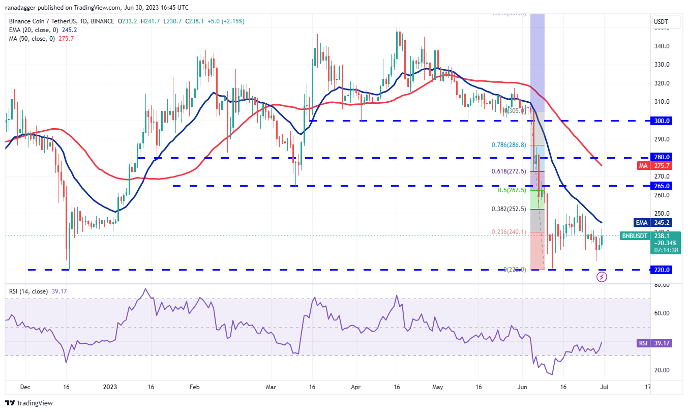 BNB (BNB) slipped below the support at $230 on June 28 but the long tail on the candlestick shows that the bulls aggressively purchased the dip.
