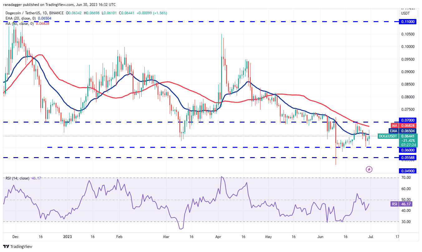The flattish 20-day EMA ($0.07) and the RSI just below the midpoint suggest a range-bound action in the near term. The price may swing between $0.06 and $0.07 for a while longer. This neutral view will tilt in favor of the buyers if they thrust and sustain the price above the overhead resistance at $0.07. The DOGE/USDT pair may then climb to $0.08.