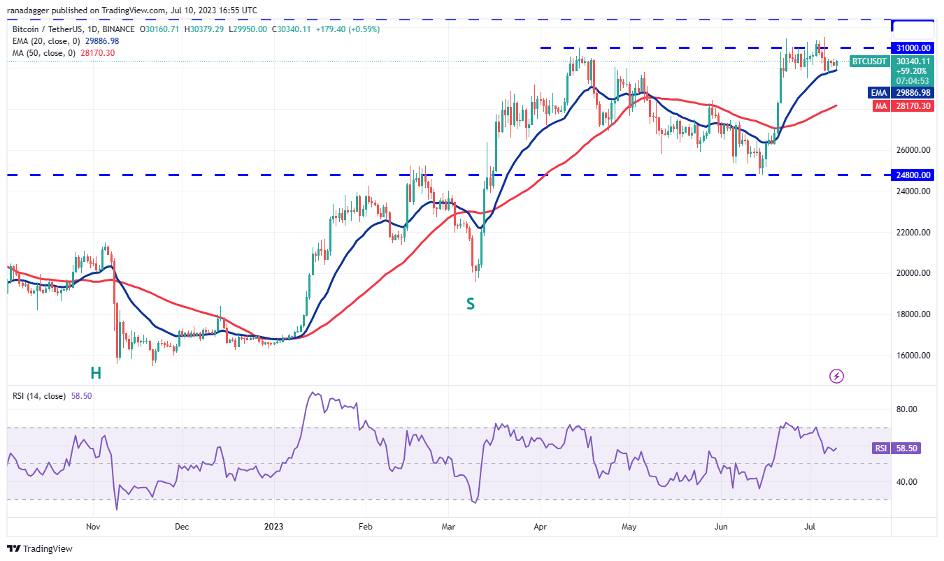 Bitcoin bounced off the 20-day EMA ($29,886) on July 7 but returned to retest the level on July 10. The repeated retest of a support level within a short time tends to weaken it.