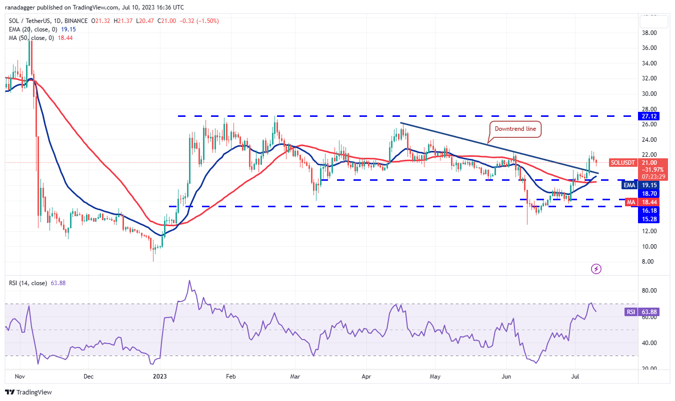 The SOL/USDT pair could correct to the 20-day EMA ($19.15), which is an important support to keep an eye on. If the price rebounds off this level, the bulls will again try to clear the overhead hurdle at $22. If they can pull it off, the pair will complete a bullish head and shoulders pattern. The pair could then start a rally toward $27.12.