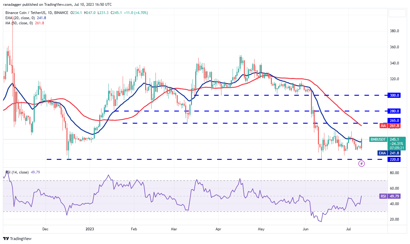 The bulls successfully held the support at $230 and pushed BNB (BNB) above the 20-day EMA ($241) on July 10. This indicates solid buying at lower levels.