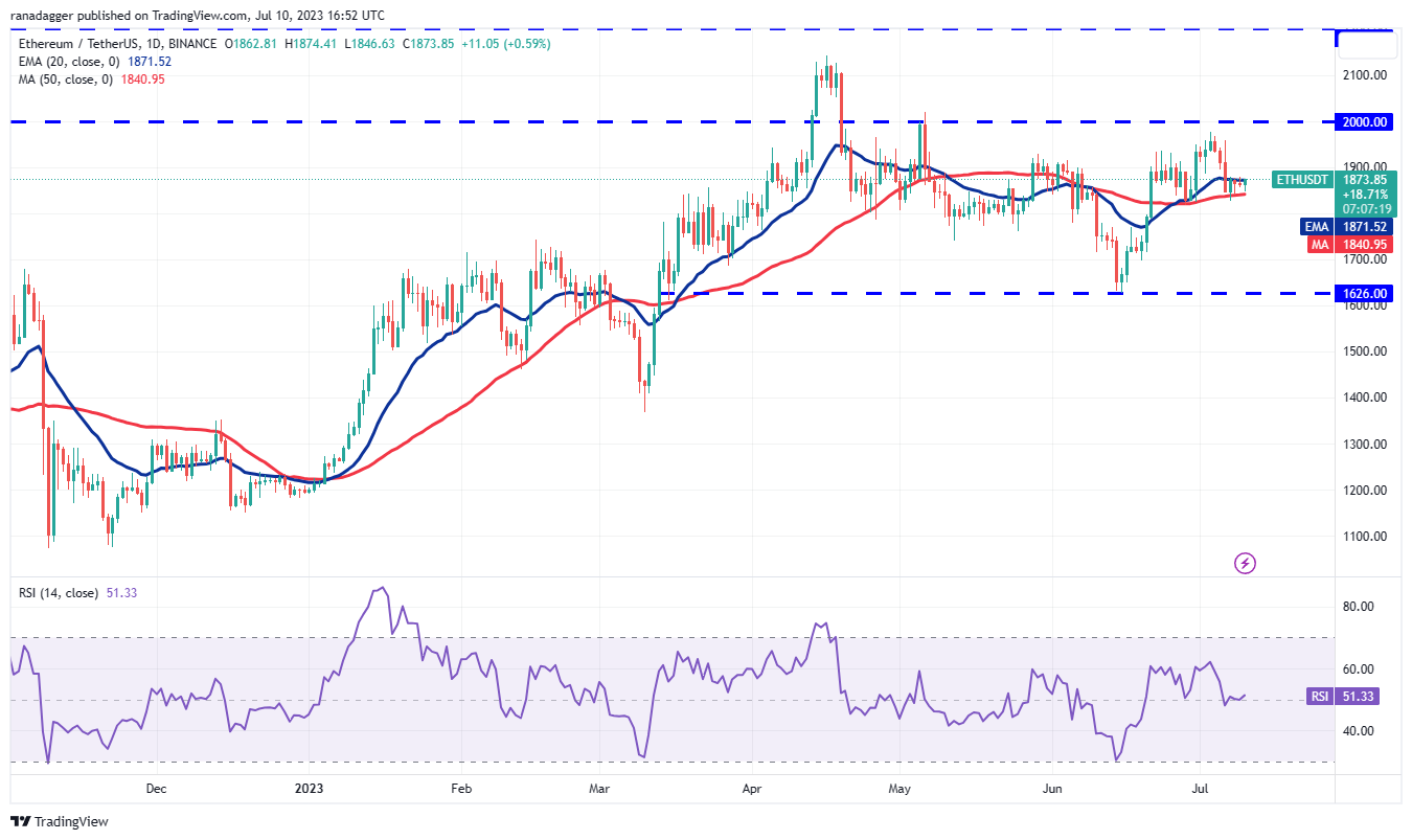 Both moving averages have flattened out and the RSI is near the midpoint, signaling a balance between supply and demand. If buyers kick the price above the 20-day EMA, the ETH/USDT pair may climb to the overhead resistance at $2,000.