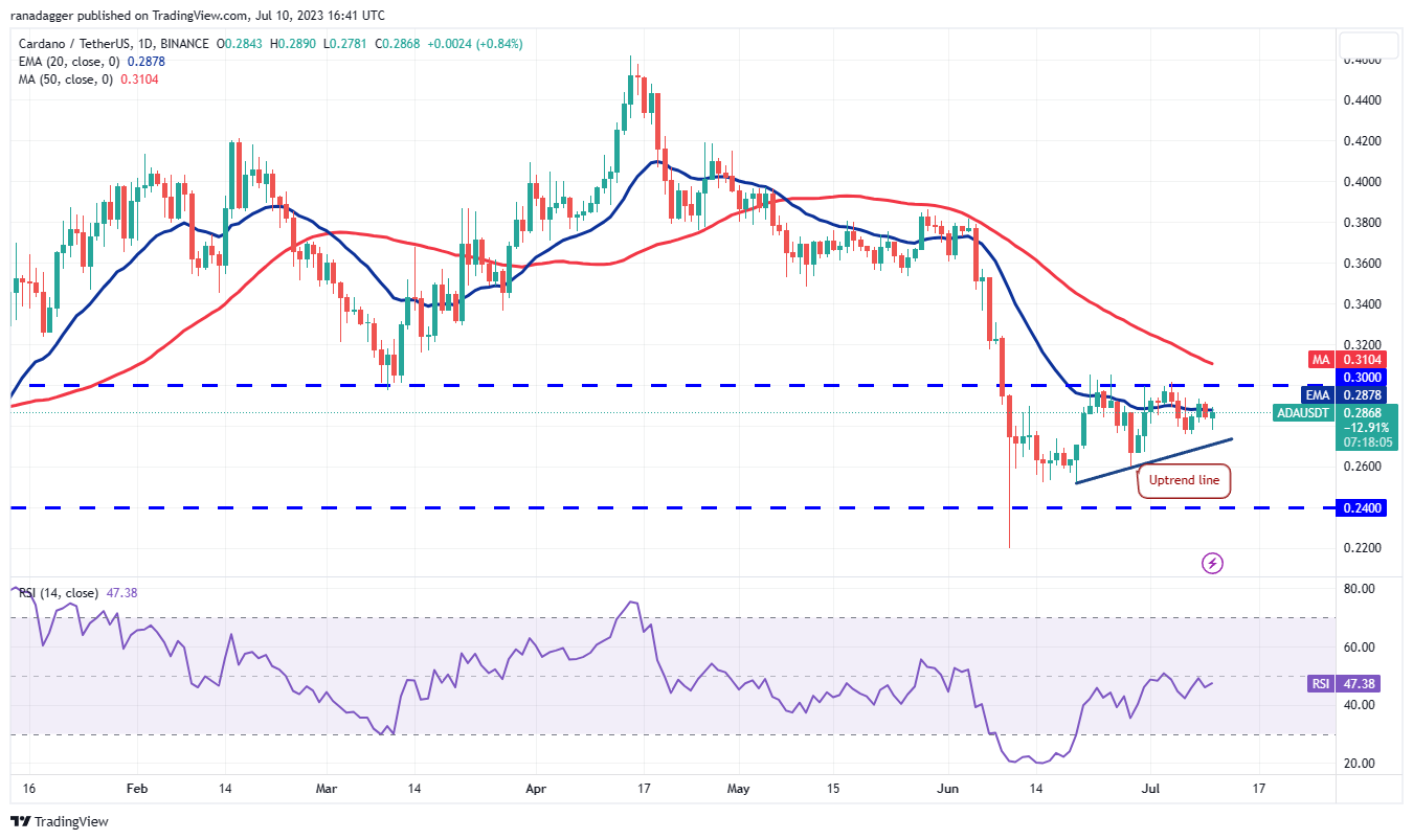 Buyers pushed Cardano (ADA) above the 20-day EMA ($0.29) on July 8 but they could not sustain the higher levels. The bears pulled the price back below the 20-day EMA on July 9.