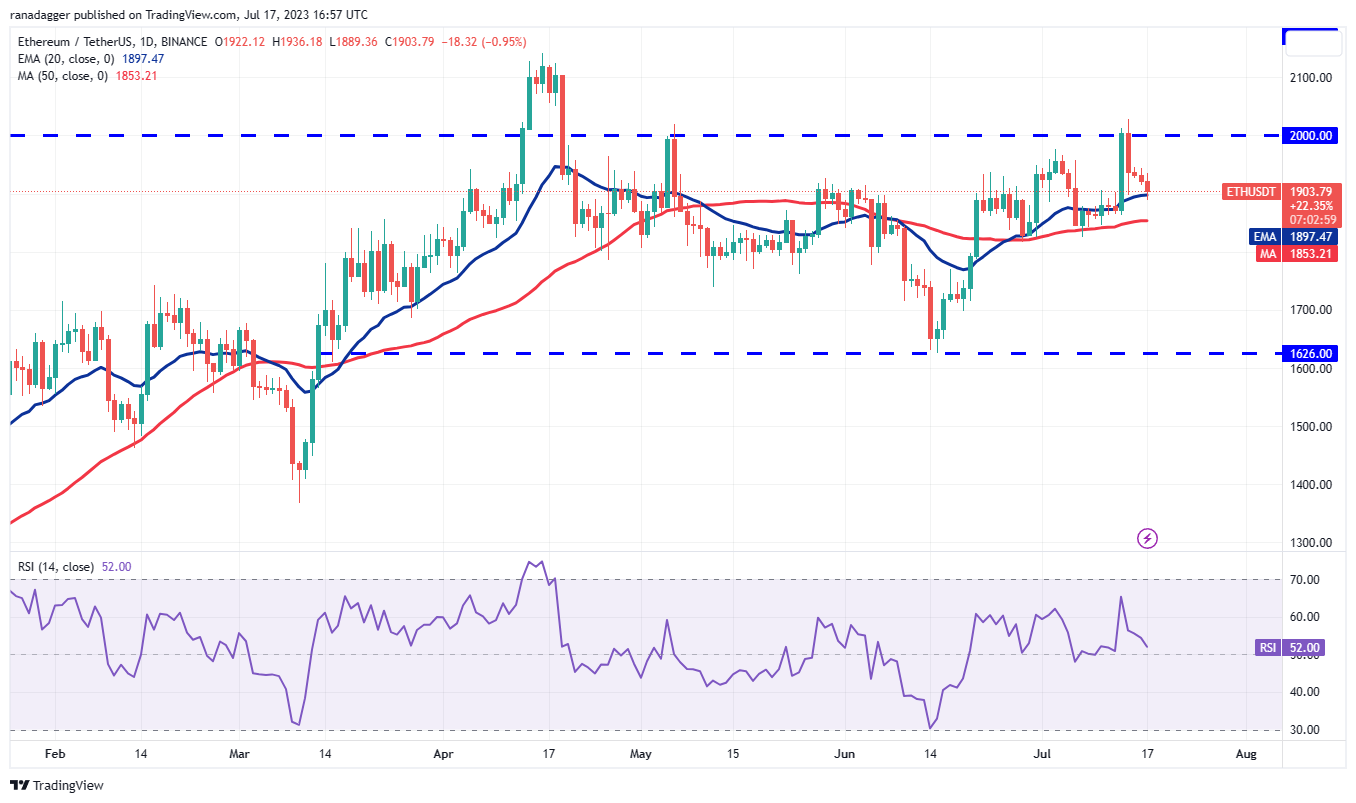 Ether (ETH) is trying to maintain above the 20-day EMA ($1,897), suggesting that the lower levels are attracting buyers.