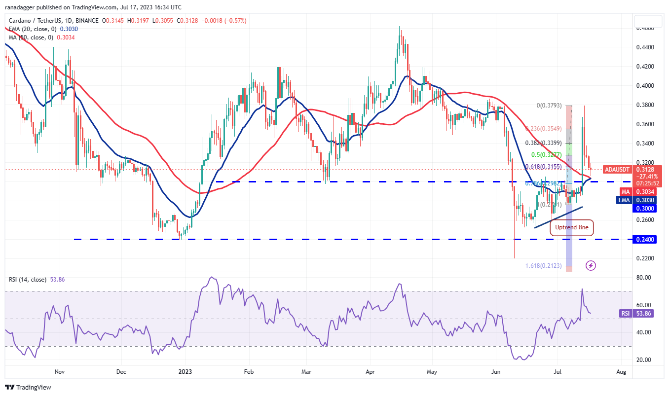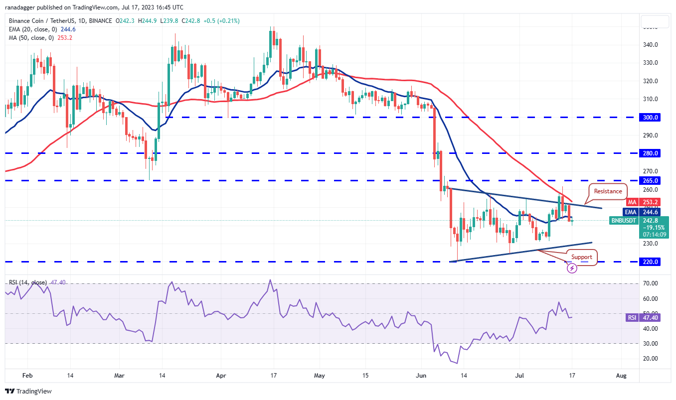 BNB (BNB) turned down from the 50-day SMA ($253) and reentered the symmetrical triangle pattern on July 14. This shows that the bears are fiercely defending the overhead resistance at $265.